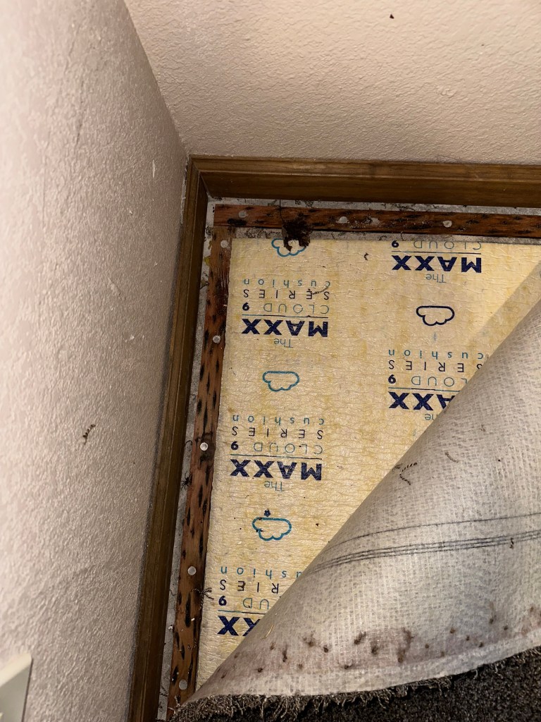 - Carpet: Move the carpet back and inspect the carpet tack strips for discoloration, which can indicate water damage.